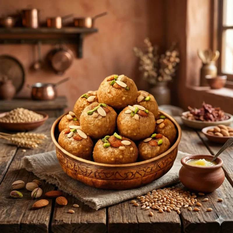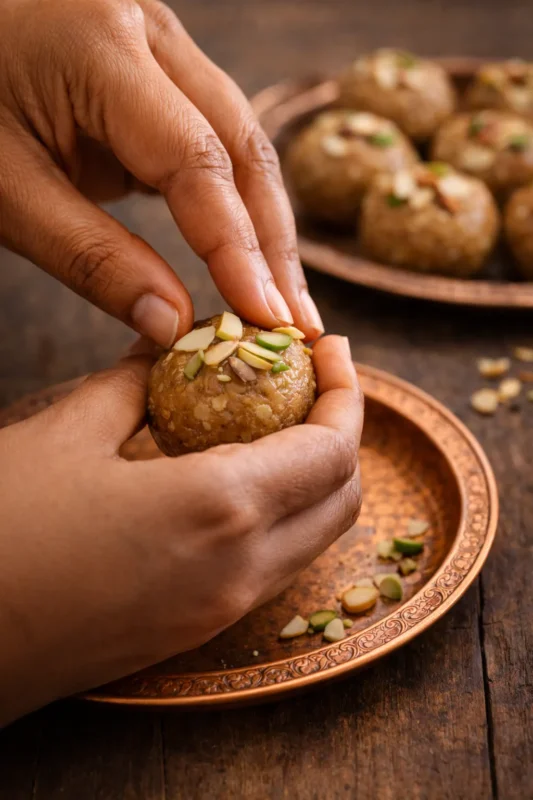 The roasted atta cools slightly before blending with powdered sugar, cardamom, and more ghee for a cohesive dough. Each ingredient harmonizes—nuts add crunch, jaggery sweetness balances richness—creating a nutrient-packed mixture full of winter warmth and energy. Mom's careful proportions guarantee consistent taste and wholesomeness.